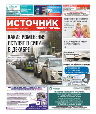Еженедельная газета «Источник твоего города» распространяется в Кировской области. На страницах издания публикуется актуальная и полезная информация.