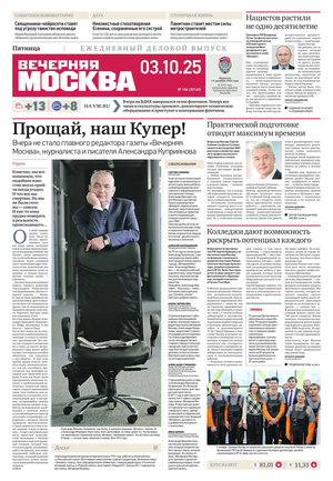 Вечером на страницах «Вечерки» появляются эксклюзивные интервью ньюсмейкеров культуры и шоу-бизнеса, репортажи журналистов по вечерней Москве, афиша нашего города. Один раз в неделю выходит специальный студенческий вечерний номер.